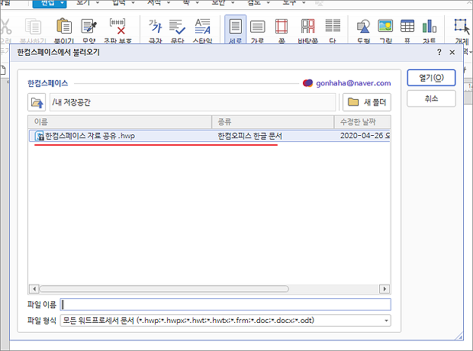 ▼ 이렇게 저장한 파일은 바로 불러올 수 있습니다. 한컴스페이스에서 불러오기 를 눌러 보세요.