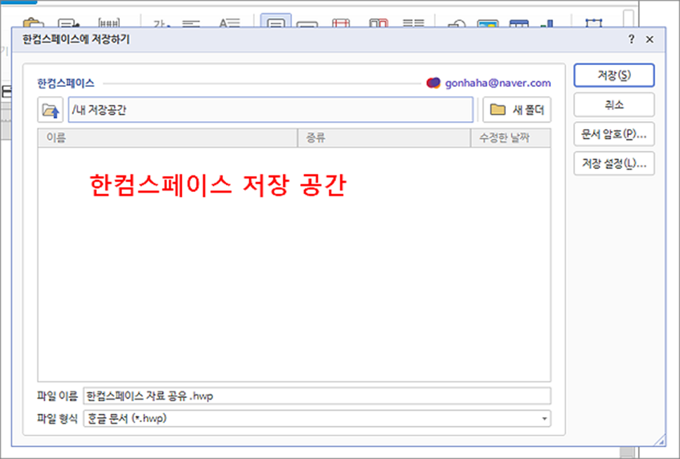 ▼ 화면에는 연결된 한컴스페이스 저장 공간이 나타나고 파일 이름을 지정한 후 오른쪽 상단에 저장 버튼을 클릭합니다.