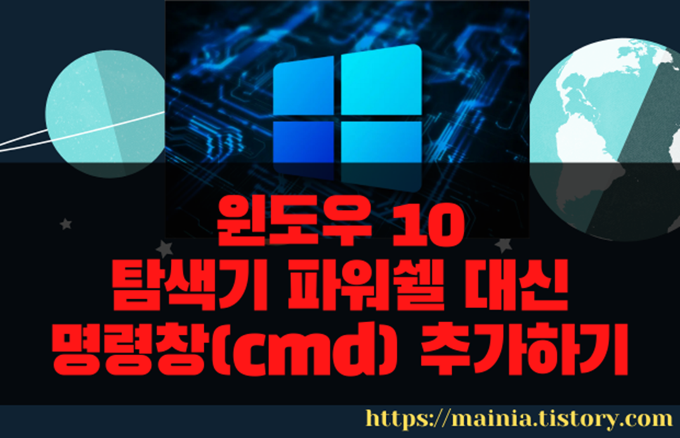 윈도우10 에서 사용할 수 있는 콘솔창은 두 종류가 있습니다. 파웨쉘(PowerShell) 과 명령프롬프트(cmd) 입니다. 대부분의 사용자는 이전 윈도우에서 자주 사용하던 "명령프롬프트" 명령창에 익숙합니다. 그런데 윈도우10 탐색기의 빠른 실행 메뉴에 등록된 명령창은 파워쉘입니다. 좀더 쉽게 설명하자면 기본 콘솔창을 해당 폴더에서 실행하기 위해 탐색기에서 오른쪽 마우스를 눌러 “여기서 명령 창 열기” 메뉴를 이용합니다. 하지만 윈도우10 의 탐색기 기본 기능에는 파워쉘 창을 실행하는 메뉴밖에 없습니다. 오늘은 빠른 실행 메뉴에 파워쉘이 아닌 도스 명령창이 나타나도록 설정을 변경하는 방법에 대해 알아보겠습니다.