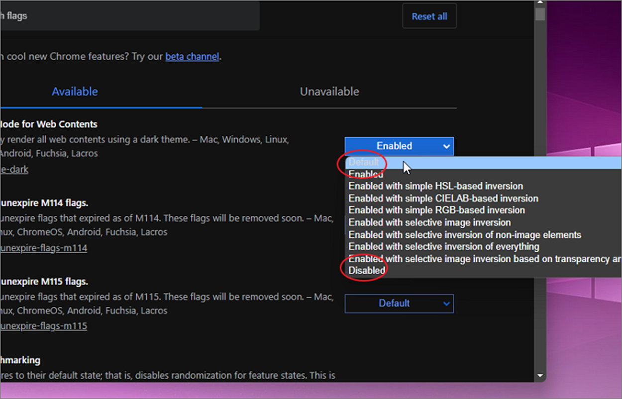 ▼ 다음은 크롬 내부 플래그 정보를 변경해서 만든 다크모드를 원래 상태로 돌려 보겠습니다. 다시 "Auto Dark Mode for Web Contents” 항목을 찾아 Enabled 에서 Default 혹은 Disabled 로 변경합니다.