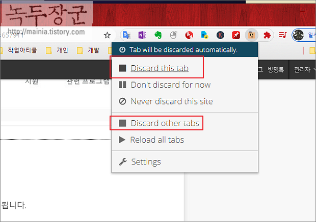 ▼ 화면에 나와 있는 확장프로그램 아이콘을 클릭해 보세요. 제어 화면에 나와 있듯이 자동으로 점유율 낮추는 작업을 진행합니다. 만약 중지하고 싶다면 Don't discard for now 메뉴를 클릭합니다. 사용하지 않는 나머지 탭들에 대한 점유율을 낮출 때는 Discard other tabs 을 이용합니다.