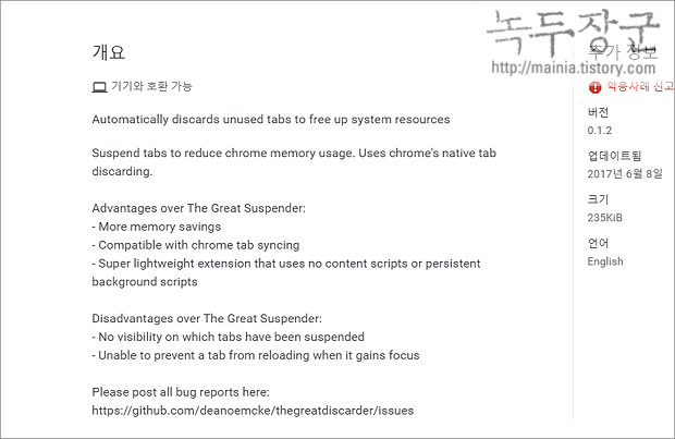 ▼ 설명에도 나와 있지만 확장프로그램은 탭에서 점유하고 있는 메모리를 해제하는 역할을 합니다.