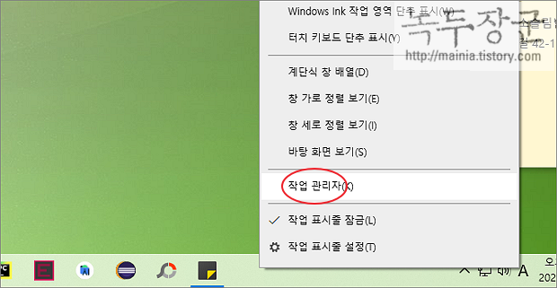 ▼ 먼저 Google Chrome 의 메모리 점유율을 확인해 보겠습니다. 작업표시줄에서 오른쪽 마우스를 누릅니다. 메뉴 목록에서 작업 관리자를 선택합니다.