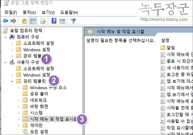 ▼ 그룹 정책 편집기 창이 뜨면 차례대로 사용자 구성 > 관리 템플릿 > 시작 메뉴 및 작업 표시줄을 찾아 선택합니다.