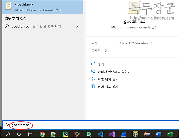 ▼ 만약 시스템 아이콘 켜기에서 전원을 켬으로 설정했는데도 나타나지 않는다면 그룹 정책 편집기로 가서 설정을 변경해 보도록 하겠습니다. 검색창에 "gpedit.msc" 를 입력해서 그룹 정책 편집기를 찾아 실행합니다.