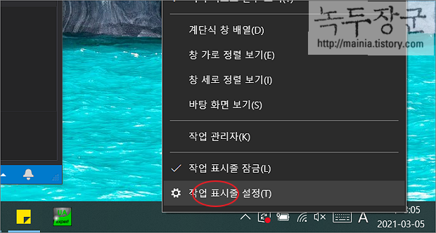 ▼ 혹시 시스템 아이콘 설정에 배터리 표시가 사용 안 함으로 되어 있는지 확인해 보겠습니다. 작업 표시줄에서 오른쪽 마우스를 누르고 메뉴 목록에서 작업 표시줄 설정 을 선택합니다.