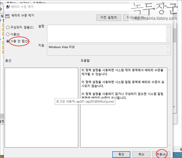 ▼ 예외 적인 경우에 배터리 수준 제거 정책이 적용될 수 있으므로 강제로 사용하지 않도록 변경합니다. 옵션을 사용 안 함으로 선택하고 아래로 내려가서 적용 버튼을 클릭합니다.