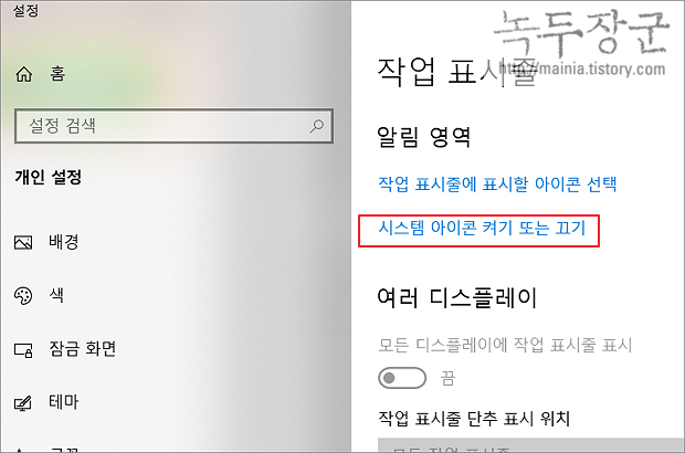 ▼ 작업 표시줄 설정 화면에서 시스템 아이콘 켜기 또는 끄기 링크를 찾아 클릭합니다.
