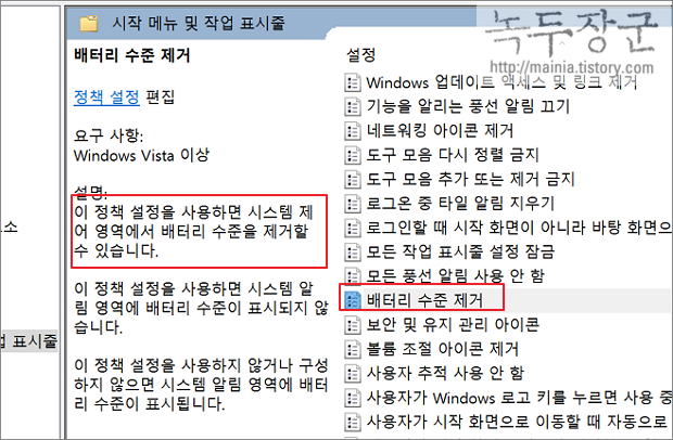 | ◎ 그룹 정책기에서 배터리 수준 제거 사용 안 함 |