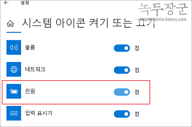 ▼ 시스템 아이콘 켜기 또는 끄기 상세 화면에서 목록에 전원 항목을 찾습니다. 켬으로 되어 있는지 확인합니다.