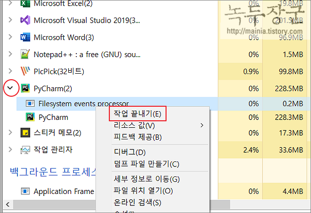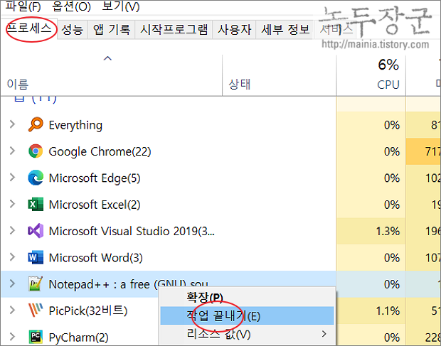 ▼ 작업 관리자 대화상자가 뜨면 프로세스 탭으로 이동합니다. 프로세스 목록에서 상태 중지인 프로그램을 찾아 오른쪽 마우스 > 작업 끝내기 메뉴를 선택합니다.