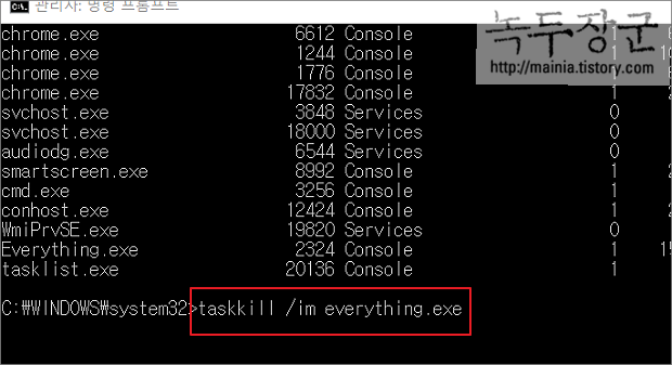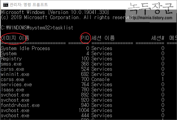 ▼ 먼저 종료할 프로세스를 찾기 위해 tasklist 유틸을 실행합니다. tasklist 로 현재 실행되어 있는 프로세스를 모두 보여 줍니다. 종료를 위해서는 두 가지 정보 중 하나를 알아야 합니다. 이미지 이름과 PID 정보를 알고 있다면 바로 taskkill 유틸을 사용해서 종료할 수 있습니다.