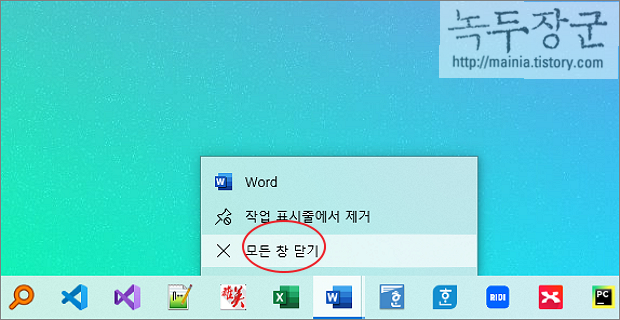 ▼ 보통 프로그램이 멈추면 작업 표시줄에서 실행 아이콘에서 마우스를 가져간 후 오른쪽 마우스를 누릅니다. 그리고 모든 창 닫기 메뉴를 선택합니다. 만약 프로그램이 종료가 되지 않는다면 다른 방법으로 조치를 취해야 합니다.