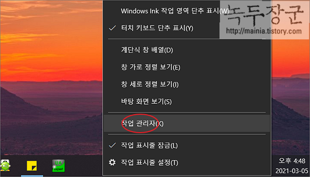 ▼ 작업 관리자에서 프로세스 끝내기로 프로그램을 종료해 보겠습니다. 작업 관리자를 띄우는 단축키는 Ctrl + Shift + ESC, Ctrl + Alt + Del 입니다. Ctrl + Alt + Del 은 작업 표시줄이 바로 나타나지 않고 화면의 메뉴 목록에서 선택해야 합니다. 또 다른 방법은 작업 표시줄에서 오른쪽 마우스를 누른 후 작업 관리자 메뉴를 선택하는 것입니다.