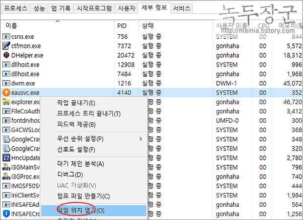 ▼ 만약 exe 이름만으로 어떤 프로그램인지 모르겠다면 파일 위치로 이동해서 확인해 보세요. 파일이 설치된 폴더 위치로 가면 어떤 프로그램의 exe 파일인지 쉽게 알 수 있을 겁니다.