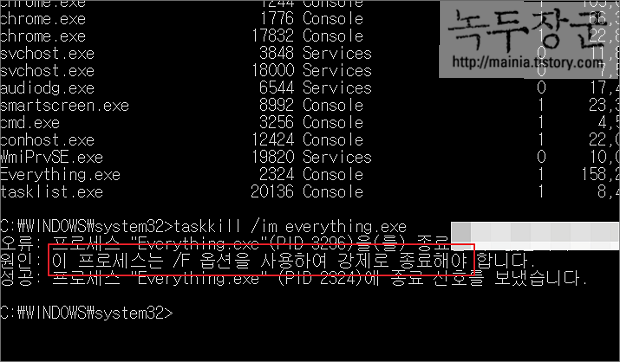 ▼ 두 번째는 /pid 매개변수명 뒤에 프로세스 ID 를 입력해서 종료하는 방법입니다. taskkill /pid [프로세스 ID] 과 같습니다. 강제로 종료하고 싶다면 /F 매개변수를 넘깁니다.