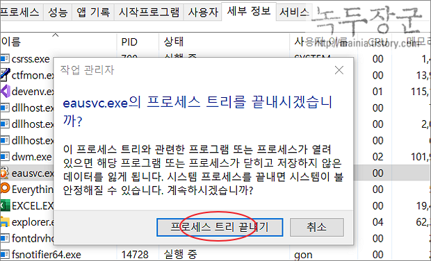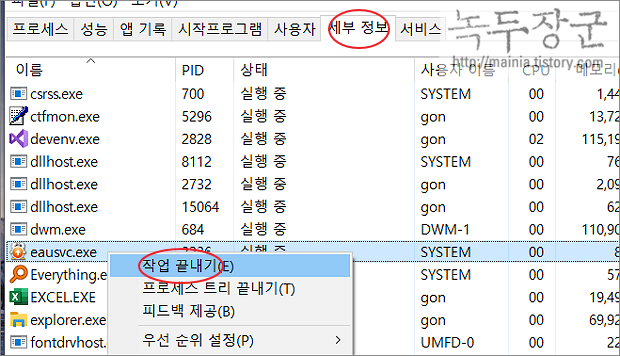 ▼ 만약 프로세스 탭에서도 종료가 안된다면 세부 정보 탭으로 이동해서 해당 exe 파일을 찾아 작업을 끝냅니다.