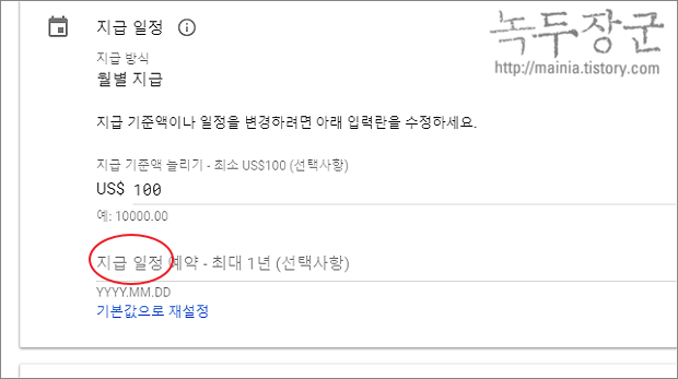 ▼ 지급 일정 항목은 매달 지급이 아닌 지정한 날짜에 받을 수 있도록 해 주는 옵션입니다. 매달 정해진 지급 일정은 변경할 수 없습니다. 하지만 지급 일정을 예약해서 보류는 가능합니다. 최대 1년까지 입니다. 지금 일정 예약 입력란을 클릭하면 달력이 뜹니다.