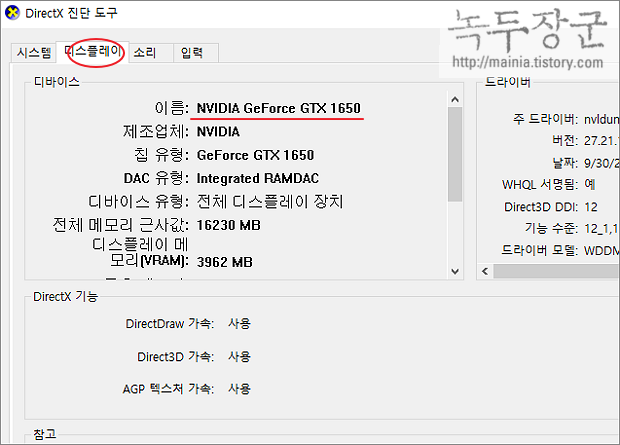 ▼ DirectX 진단 도구의 디스플레이 탭으로 가면 디바이스 항목에 그래픽 카드 이름이 나와 있습니다. 저는 NVIDIA Geforce GTX 1650 을 사용하고 있습니다.