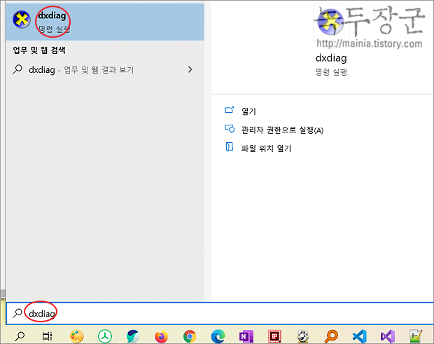 ▼ 먼저 자신의 그래픽카드가 무엇인지 먼저 확인합니다. 검색창에 dxdiag를 입력해서 다이렉트X 진단 도구를 찾아 띄웁니다.