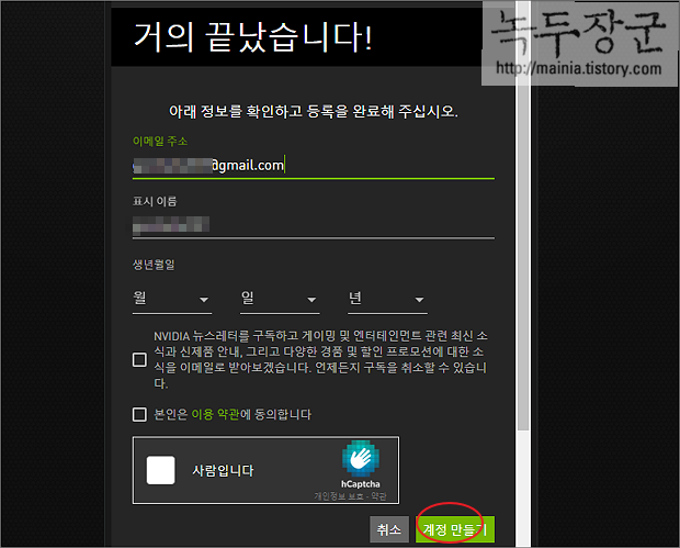 ▼ 다시 Geforce Experience 화면으로 돌아와서 나머지 계정 정보를 입력합니다. 생년월일을 입력한 뒤 이용약관 동의 유무를 체크하고 계정 만들기 버튼을 클릭합니다.