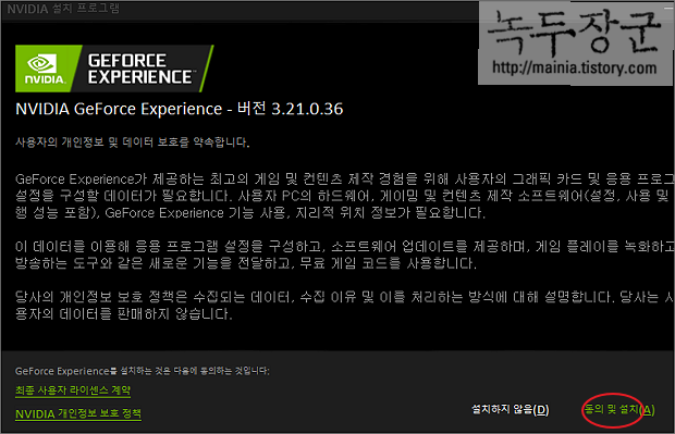 ▼ 지포스 익스피리언스(Geforce Experience) 프로그램을 다운받은 후 설치를 진행합니다. 화면에 라이센스와 개인정보 보호에 관한 내용에 동의하는지 묻는 창이 뜹니다. 동의 및 설치 버튼을 눌러 다음으로 이동합니다.