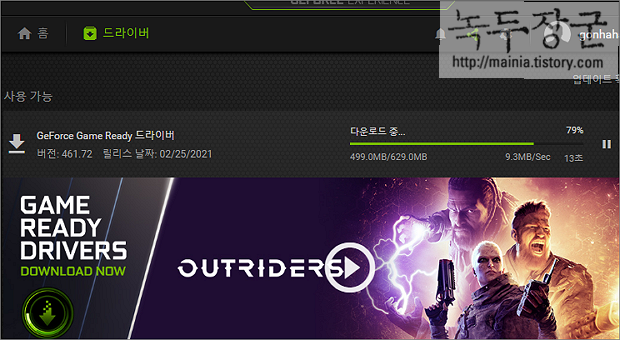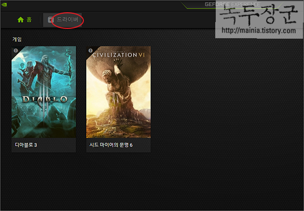 ▼ 이제 드라이버 업데이트를 진행해 보겠습니다. Geforce Experience 프로그램을 실행하고 왼쪽 상단 드라이버 메뉴를 클릭합니다.