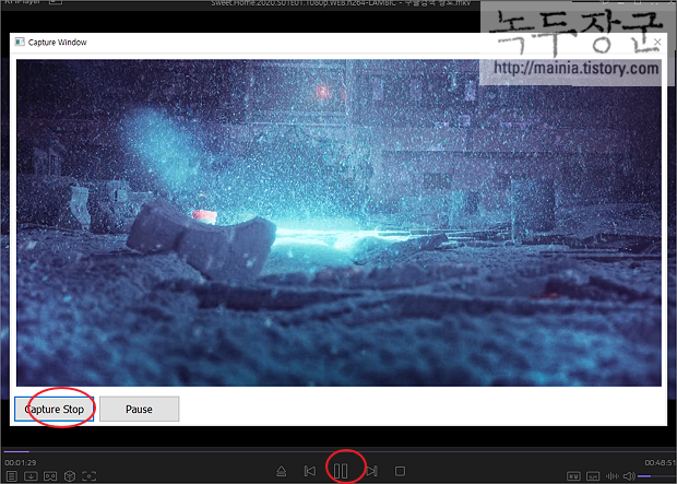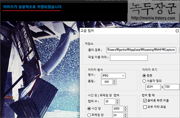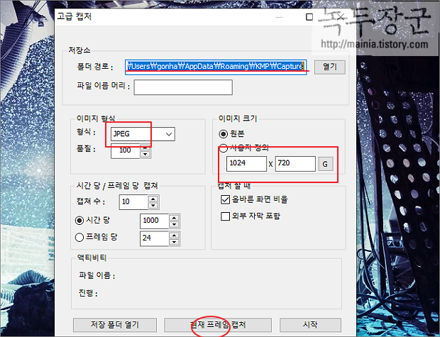 ▼ 현재 프레임 캡처 버튼을 누르면 현재 화면을 이미지로 캡처해서 저장합니다.