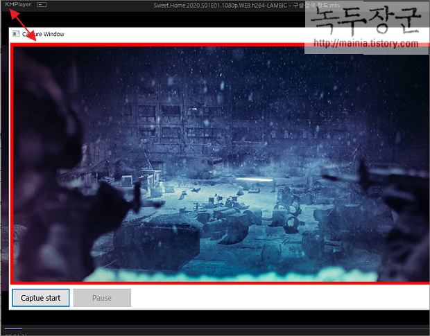 ▼ 영상을 시작하고 캡처 윈도우 창에 캡처도 버튼을 눌러 시작합니다. 영상에 캡처 화면을 가져가서 GIF 를 만들기 위한 작업이 진행됩니다.