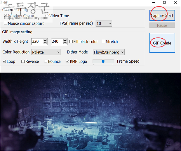 ▼ 지금까지 캡처한 영상 이미지를 GIF 생성하기 위해 GIF Create 버튼을 클릭합니다. 파일 저장 대화상자가 나타나면 폴더를 지정하고 창을 닫습니다.