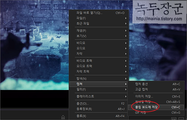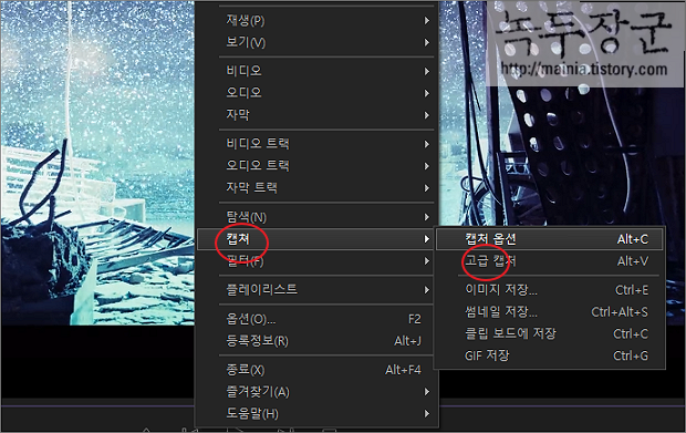 ▼ 먼저 기본 화면 캡처 기능인 고급 캡처부터 알아봅니다. 영상에서 오른쪽 마우스를 누른 후 캡처 > 고급 캡처 메뉴를 선택합니다.