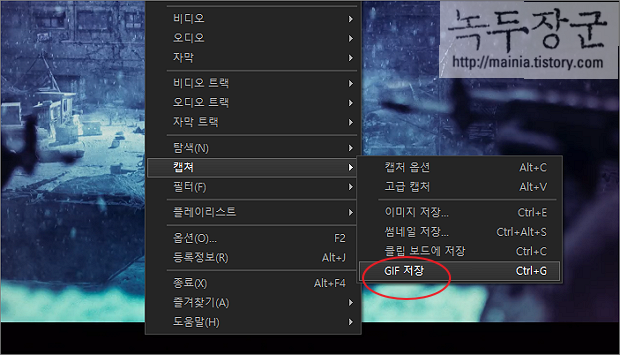 ▼ GIF 는 움직임을 저장할 수 있는 이미지 포맷으로 영상의 여러 장면들을 이어서 GIF 로 만들어 배포합니다. 메뉴는 캡처 > GIF 저장입니다. 단축키는 Ctrl + G 입니다.
