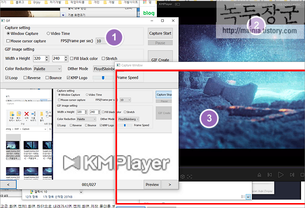 ▼ GIF 저장 메뉴를 선택하면 새로운 2개의 화면이 나타납니다. 첫 번째는 GIF 캡처 설정 창입니다. 두 번째는 KM 플레이어 화면입니다. 세 번째는 캡처 창으로 윈도우 어디든 위치를 지정할 수 있습니다. KM 플레이어 화면에 맞춰서 화면을 GIF 로 만드는데 주로 사용합니다. 다른 화면 동작을 GIF 로 만들고 싶을 때 사용하기도 합니다.