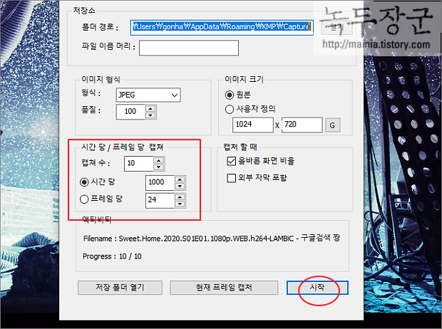 ▼ 시작은 정해진 시간 간격 마다 정해진 캡처 수만큼 작업을 진행하는 연속 캡처 기능입니다. 현재 설정은 1초(1000ms) 마다 1장씩 캡처해서 10장을 찍습니다. 시작 버튼을 눌러 연속 캡처를 진행합니다.