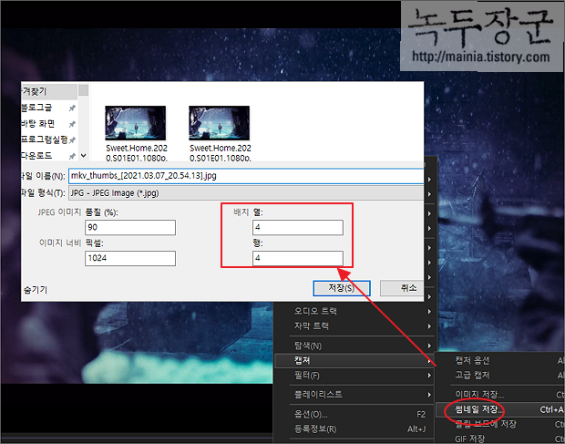 ▼ 영상 캡처 기능 중 하나인 썸네일 이미지는 영화 소개할 때 많이 사용합니다. 영상 시작에서 끝까지 일정한 한격으로 정해진 개수만큼 캡처한 후 작은 이미지로 액자처럼 배치해서 만든 이미지입니다. 오른쪽 마우스 캡처 > 썸네일 저장 메뉴를 선택합니다. 화면에 뜬 썸네일 설정 대화상자에서 이미지 품질, 픽셀 크기, 배치할 열과 행 개수를 입력합니다. 기본 행, 열은 4x4 로 16장의 작은 이미지가 1024 픽셀의 이미지 한 장에 들어갑니다.