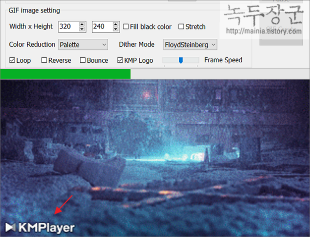 ▼ 그림처럼 녹색바가 끝까지 진행되면 GIF 생성이 끝납니다. KM 플레이어의 GIF 생성 기능의 단점은 GIF 생성 화면에 KMPlayer 라는 워터마크가 남는다는 것입니다.