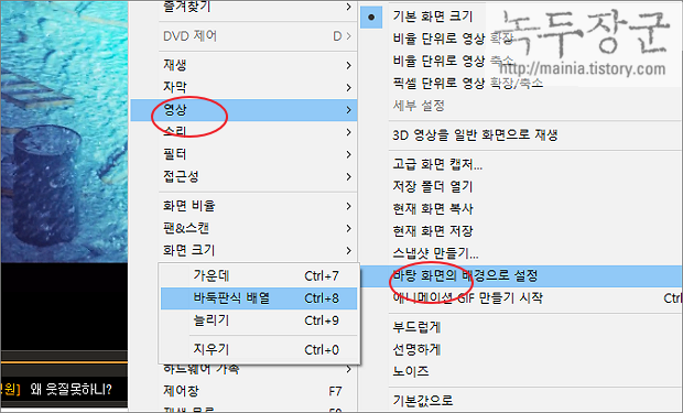 ▼ 다른 동영상 플레이어에 없는 특이한 것 중 하나가 캡처 이미지를 바탕화면의 배경으로 설정하는 기능입니다. 오른쪽 마우스 영상 > 바탕 화면의 배경으로 설정 > 늘이기, 가운데 를 선택합니다.