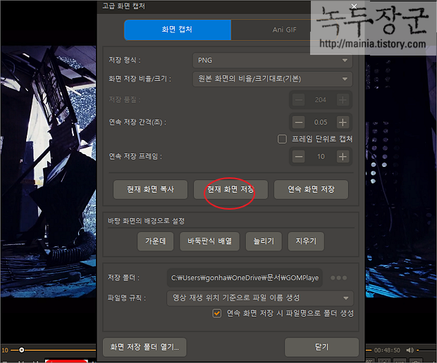 ▼ 두 번째는 사용자가 설정한 옵션에 맞게 연속으로 화면을 캡처하는 방법입니다. 저장 형식에서 이미지 파일의 포맷을 정합니다. 그리고 연속 저장 간격과 연속 저장 프레임을 정합니다. 아래 설정대로라면 0.05초 간격으로 연속 10장을 캡처하고 종료합니다.