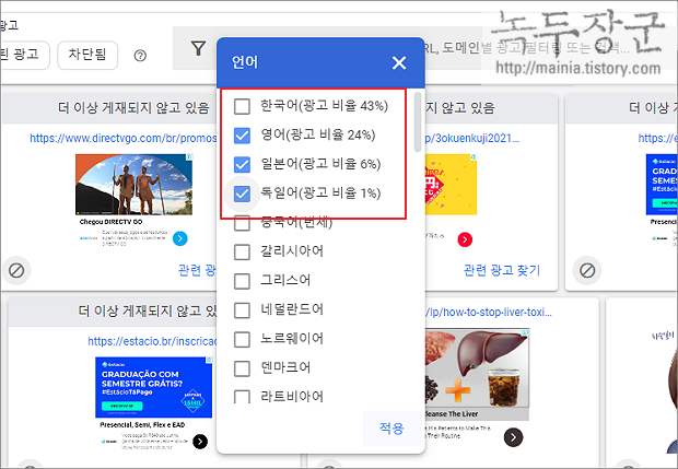 ▼ 화면의 언어 목록에는 광고 비율이 표시되어 있습니다. 비율에 따라 내림차순으로 정렬해서 보여줍니다. 한국어를 제외한 나머지 광고 언어를 선택하고 적용 버튼을 누릅니다. 영어로 광고하는 한국 업체도 있기 때문에 신중하게 결정하세요. 한달 정도 테스트해 보고 추이를 결정하는 것이 좋습니다.