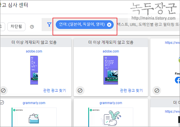 ▼ 필터 창에는 방금 생성한 조건들이 들어가 있습니다. 그리고 광고 검색 결과에 적용이 되어서 해당 언어의 광고만 나타납니다. 이제 목록에서 광고를 차단하기 더 쉽겠죠.