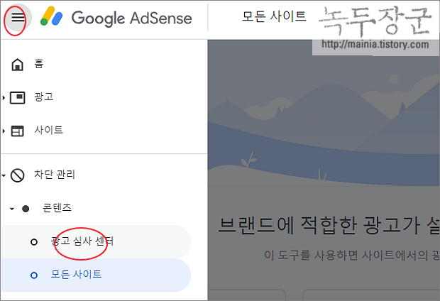 ▼ 애드센스 홈페이지에 접속한 후 왼쪽 상단 더보기 > 차단 관리 > 콘텐츠 > 광고 심사 센터 메뉴를 선택합니다.