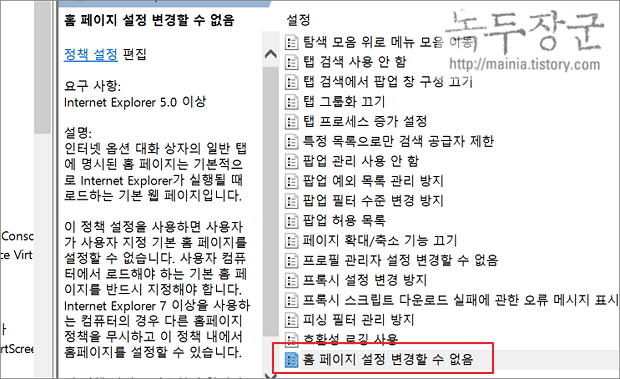 ▼ Internet Explorer 설정 목록에서 홈 페이지 설정 변경할 수 없음 항목을 찾습니다.