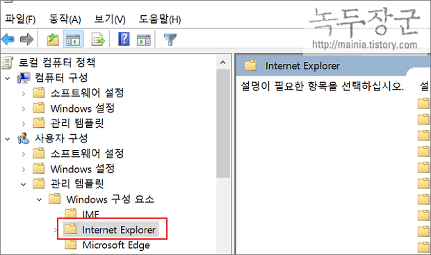 ▼ 그룹 정책 편집기에서 사용자 구성 > 관리 템플릿 > Windows 구성 요소 > Internet Explorer 메뉴를 선택합니다.