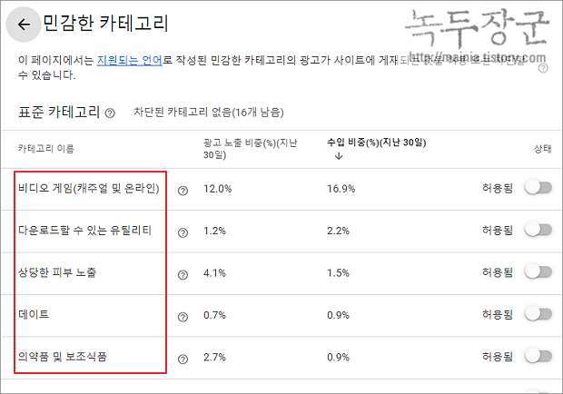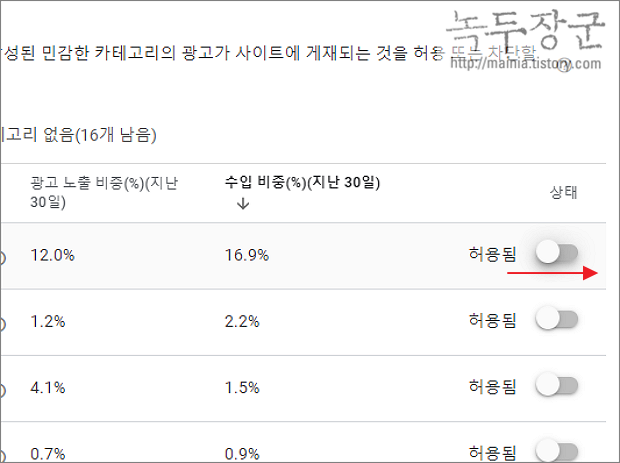 ▼ 2번 항목인 민감한 카테고리는 여러 카테고리별 허용과 차단을 할 수 있는 곳입니다. 허용 및 차단을 결정할 때 광고 노출 비중 대비 수입 비중을 참고합니다. 그러니까 광고 노출 대비 수입 비중이 떨어지는 것들은 차단을 고려해 보세요. 예를 들어 의약품 및 보조식품은 2.7% 인데 수입이 0.9% 에 못 미치고 있습니다. 하지만 지난 30일을 비교한 것이므로 지속적인 모니터링을 거친 후 결정하는 것이 좋습니다. 자신의 블로그와 상관관계가 적은 것들은 아무래도 수익률이 떨어질 수밖에 없습니다.