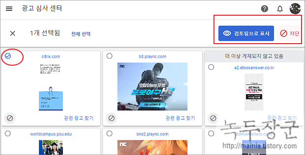 ▼ 왼쪽 상단에는 광고 선택 버튼이 있습니다. 광고를 체크하면 두 가지 메뉴가 나타납니다. 해당 사이트에서 제공하는 여러 형태에 광고를 일괄적으로 검토됨으로 변경하거나 차단을 진행합니다.