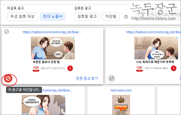 ▼ 미검토 광고와 검토된 광고를 구분해서 볼 수 있는 곳으로 개별 광고 차단이 가능한 곳입니다. 특정 광고를 차단하고 싶다면 왼쪽 하단 이 광고를 차단합니다. 버튼을 클릭합니다.