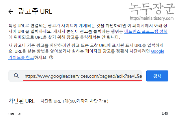▼ 1번 항목인 광고주 URL 차단하기는 광고 URL 을 알고 있는 경우 사용할 수 있는 기능입니다. 화면에 나타난 광고를 클릭하면 이동하는 웹 페이지 주소가 있습니다. 해당 주소를 광고주 URL 페이지로 가서 입력합니다.