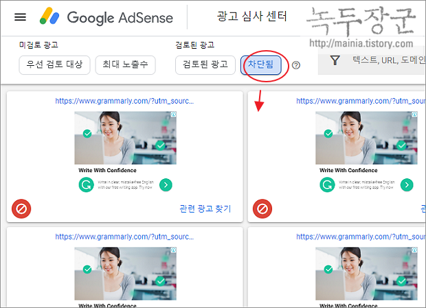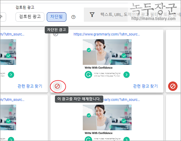 ▼ 차단한 광고를 다시 해제하고 싶다면 검토된 광고 > 차단됨 탭으로 이동합니다.