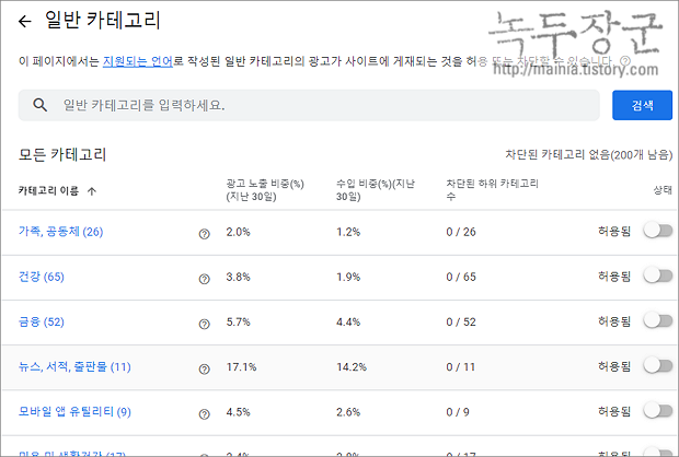 ▼ 다음은 일반 카테고리 입니다. 민감한 카테고리와 함께 광고를 그룹별로 나눠서 노출 비중과 수입 비중을 전체 % 에서 얼마나 차지하는지 알려줍니다. 30일간 측정한 비중을 참고해서 차단 여부를 결정합니다.