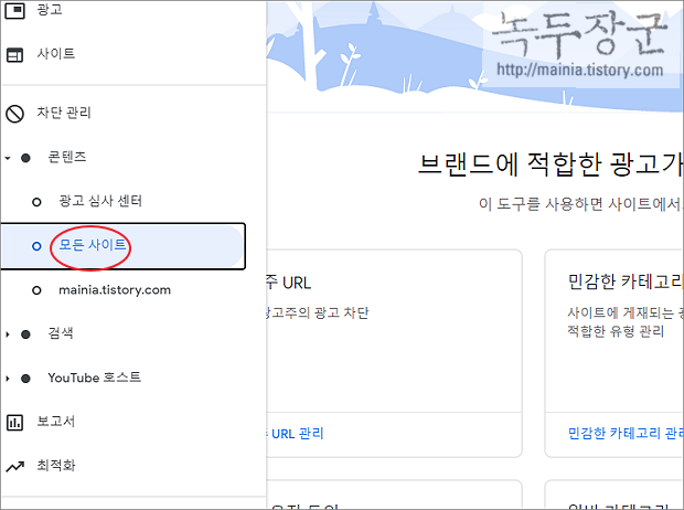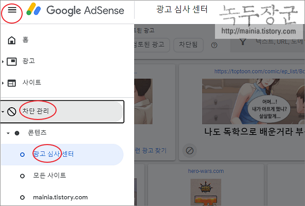 ▼ 먼저 애드센스의 차단 관리에서 첫 번째 메뉴인 광고 심시센터를 알아보겠습니다. 메뉴는 왼쪽 사이드에서 더보기 > 차단 관리 > 콘텐츠 > 광고 심사센터 입니다.
